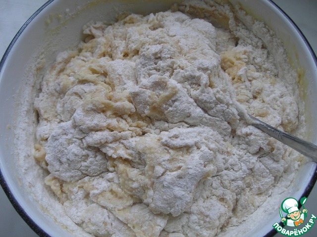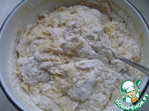 Пришло время участия муки. Здесь необходимо всыпать её постепенно и смотреть на общую консистенцию теста, оно не должно быть жидким. Если яблоки дали много сока, то понадобится больше муки.