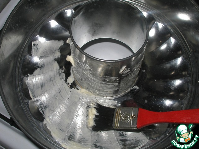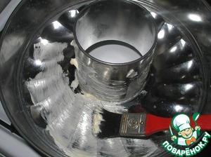 Подготавливаю форму для выпекания (она может быть любой), смазываю её маргарином и немного присыпаю мукой.