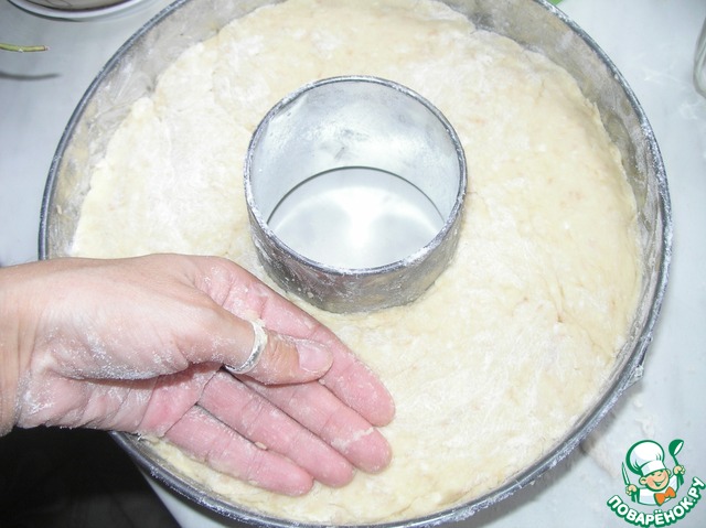 Перекладываю тесто в форму и потихоньку придавливаю его, чтобы разровнять и придать правильное местоположение. В данной форме верх уложенного теста станет основанием, поэтому я его ничем не смазываю. Однако если печь в обычной форме, тогда, конечно, смазать 1 взбитым яйцом, чтобы была красивая румяная корочка.