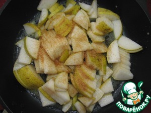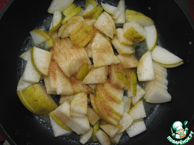 50 гр сливочного масла (из общего количества) растопить в глубокой сковороде или сотейнике, выложить груши, всыпать 20 гр сахара, припустить на медленном огне в течение 5 минут.