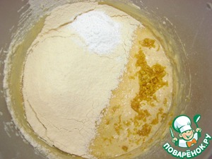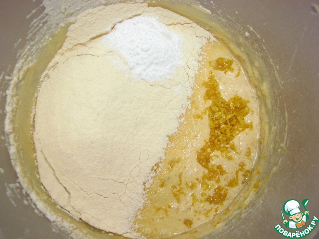 Добавить цедру лимона, два вида муки и разрыхлитель. Хорошо перемешать.