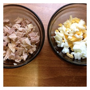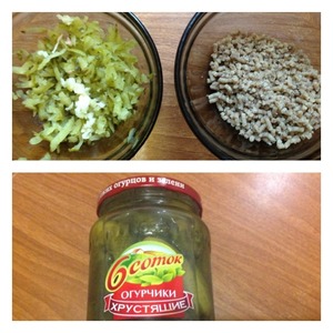 • Отварное мясо разобрать на волокна или нарезать маленьким кубиком. Яйца нарезать так же как и мясо, маленьким кубиком. Чтобы салат стал более нежным, яйца можно натереть на крупной терке.