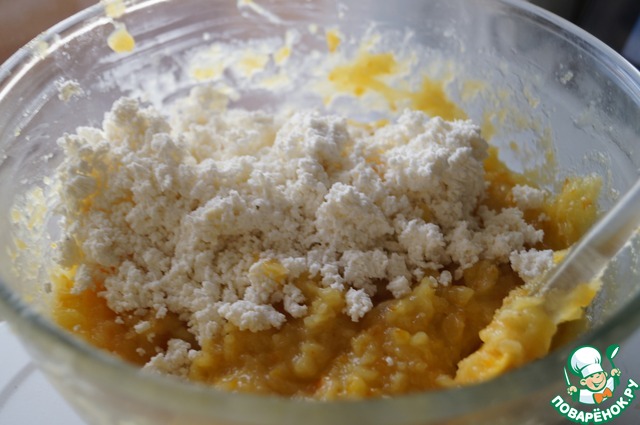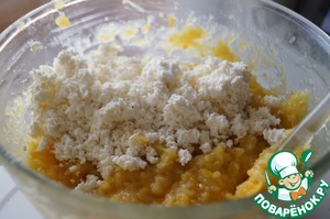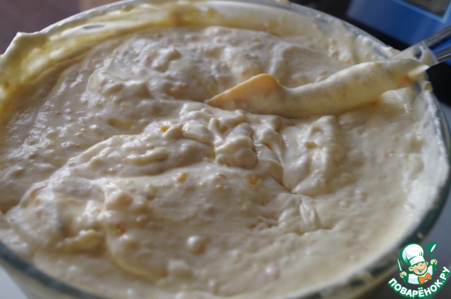 • Смешать охлажденную массу с протертым творогом и желатином. Взбить.