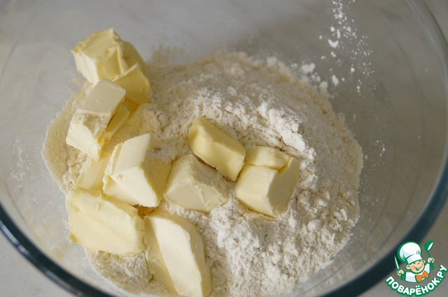 • Сначала нужно приготовить песочное тесто. Для этого в чашу выложить муку, сахар, сливочное масло и перетереть их в кошку.