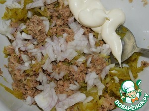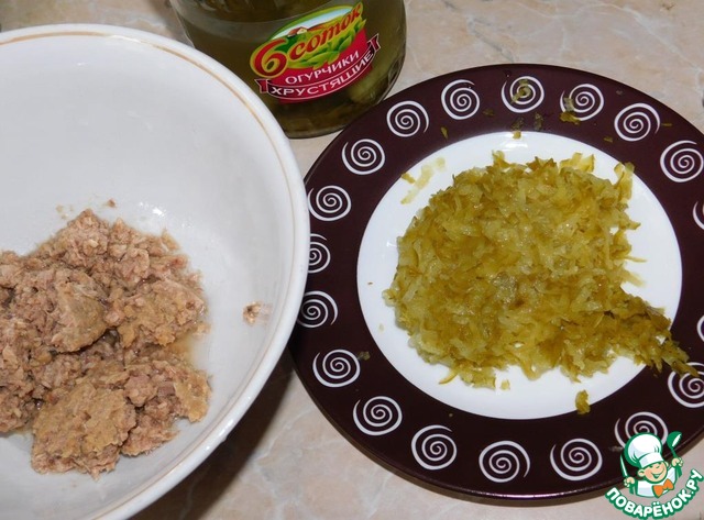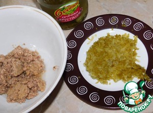 Тунец разминаем вилкой и добавляем к нему тертые маринованные огурцы.