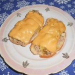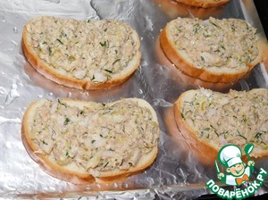 На противень наливаем растительное масло и выкладываем кусочки батона с готовой намазкой. Благодаря тому, что налито масло в итоге мы получим бутерброды на поджаренных гренках. Это будет очень вкусно!