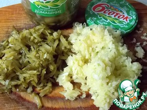 Пока тефтели стоят в духовке, натираем на крупной терке очищенный от семян болгарский перец и маринованные огурчики ТМ "6 соток".