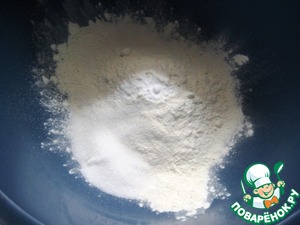 В миске соединить просеянную муку, соду, разрыхлитель теста и сахар. Перемешать.