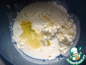 Добавить протертый творог, молоко, яичные белки, ванильный сахар.