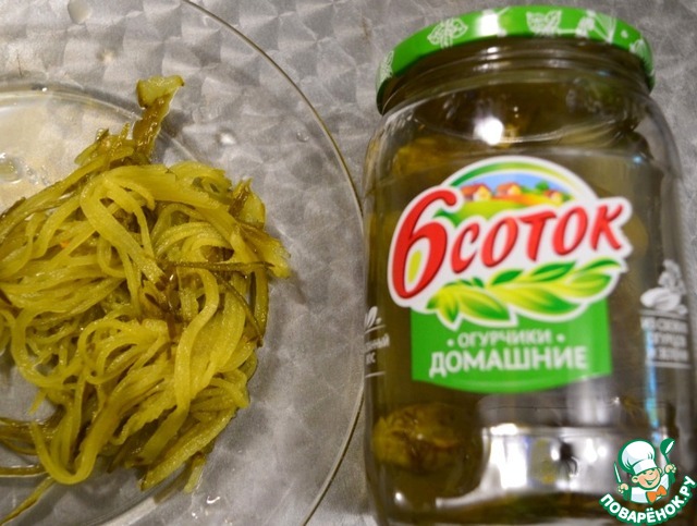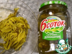 • С трудом и корябанием рук натираем на этой же тёрке маринованные огурцы.
