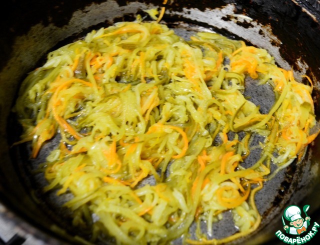 • Отправляем все овощи на сковороду пассероваться. Кабачок добавляйте самым последним, чтобы он на разварился.