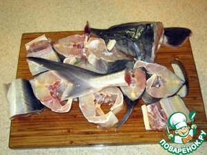Удаляем внутренности и жабры, разделываем рыбу на куски.