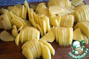 Картофель очистить, порезать тонкими кружочками или полукружьями.