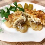 Изначально, как утверждают кулинарные историки, никаким майонезом мясо и овощи не заливались, а использовался замечательный соус бешамель. Но так было во времена Екатерины и графа Орлова. «Телятина по-орловски» включала в себя, помимо привычных ингредиентов, еще грибы. В позднейшие времена русская традиционная кухня существенно опростилась, грибы нечувствительно ушли, о телятине помышляли немногие, и для мяса по-французски брали, что под руку подвернется. Чаще всего подворачивалась если не курица, так в лучшем случае свинина, а самый демократичный вариант предполагал фарш, в котором качество исходного продукта заметной роли не играет. Бешамель – и вовсе роскошь, соус заменили майонезом, сметаной или смесью того и другого. Новейшие времена стали постепенно, пошагово возвращать блюдо к истокам. Самой неприступной позицией оказался майонез – от него отказаться почему-то труднее всего. Не стал заморачиваться и я – майонез так майонез. Два отличия от самых распространенных рецептов здесь все же есть: во-первых, запеканка у меня «двухэтажная», во-вторых – сырная корочка обильно пропитана чесноком. Таким образом, мясо по-французски приобретает явный еврейский акцент.