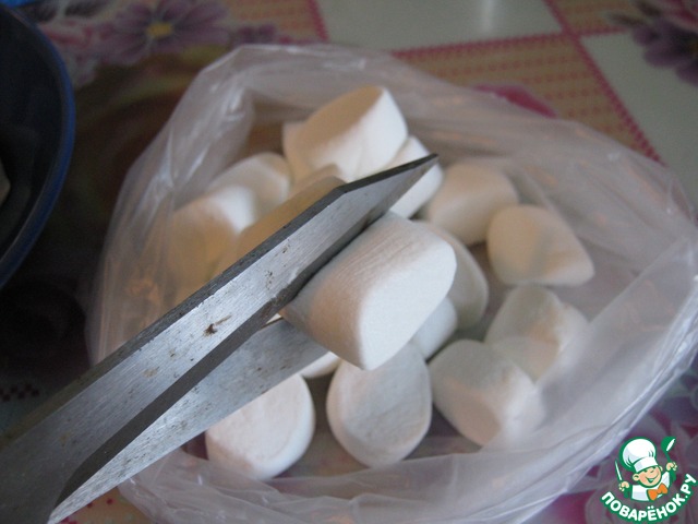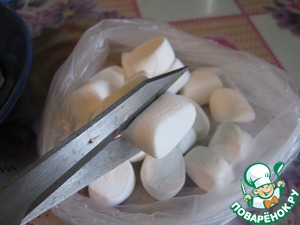 У меня крупные маршмеллоу, поэтому разрезаем их пополам и кладём в морозилку примерно на час.