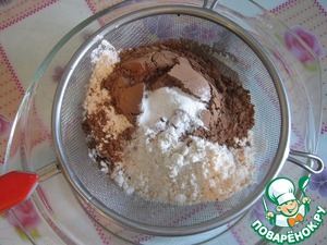 Смешиваем муку, соль, какао-порошок и разрыхлитель, просеиваем.