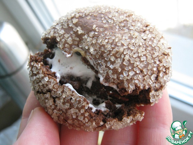 Шоколадное печенье с тянущейся серединкой из зефира маршмеллоу отлично подойдёт для чаепития в кругу семьи или друзей. Сахарная корочка сверху делает печенье вкусным и хрустящим.