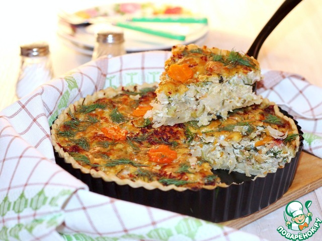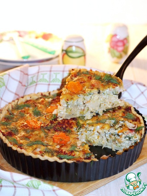 14. Заливаем начинку яичной смесью. Посыпаем тертым сыром. Можно украсить кусочками ярких овощей. Отправляем заготовку в хорошо разогретую духовку до готовности коржа, ~30 минут. Все зависит от толщины коржа, но не пересушивайте начинку.