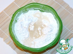 2. Готовим простую основу тарта. Смешиваем масло, воду и соль. Просеиваем муку и смешиваем с масляной смесью, вымешиваем тесто.