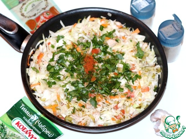 11. Мелко нарезаем петрушку, чеснок и добавляем в начинку. Добавляем сливочное масло, рассол, паприку, чабрец, перец и соль, перемешиваем. Накрываем начинку крышкой, не забываем перемешивать и тушим до готовности.