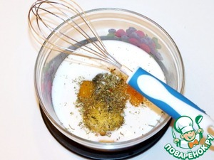 13. Приготовим заливку. Взбиваем куриные яйца с молоком, добавляем приправу, перец молотый и соль.