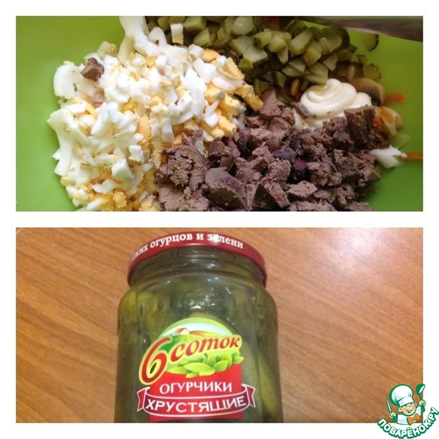 Овощи с грибами остудить и выложить в салатник. Добавить соль, смесь перцев и майонез/йогурт/сметану. Огурчики нарезать маленьким кубиком как и яйца с печенкой.