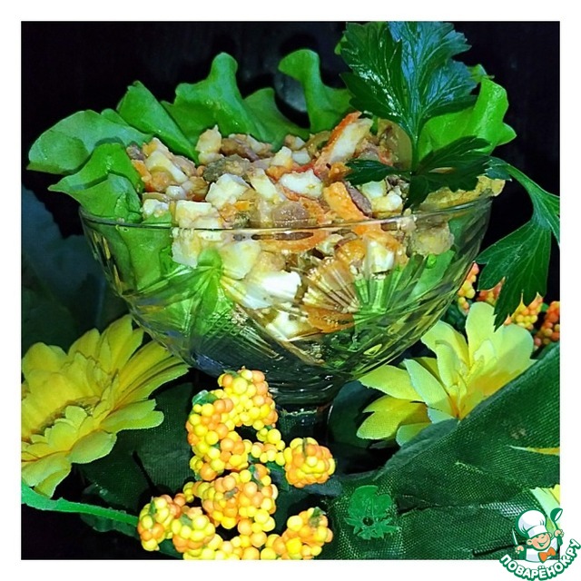 Красивый, сочный, нежный салат с куриной печенью, грибами и овощами. Сливочный, сытный, но не тяжелый. Простой, из минимума продуктов он прекрасно украсит праздничный стол и разнообразит повседневное меню. Угощайтесь!