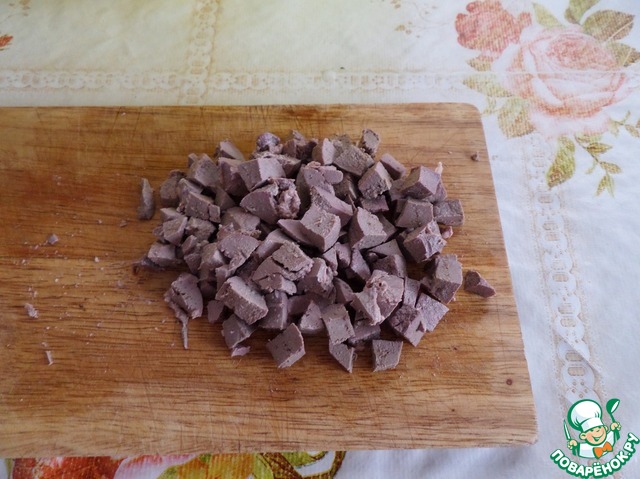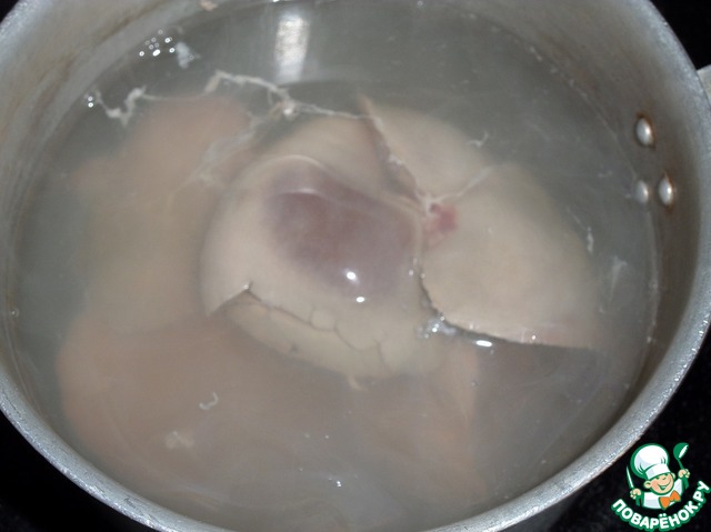 Печень кролика хорошо промываем. Закладываем в кипящую подсоленную воду ( 1 литр воды + 1 ч. л. соли). Варим 10 -12 минут. Затем воду сливаем. Печень остужаем.
