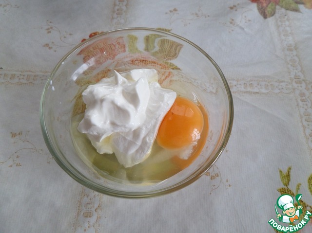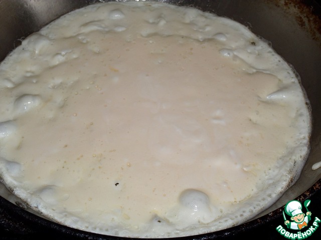 Разогретую сковороду смазываем растительным маслом. Выливаем сметанно-яичную смесь. Накрываем сковороду крышкой и готовим яичный блин - омлет 2-3 минуты. Убираем блин со сковороды и остужаем.