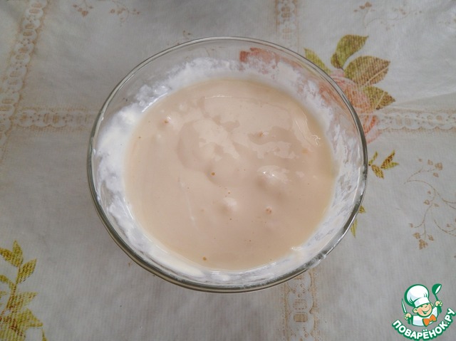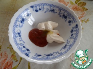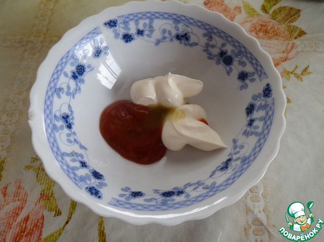 Готовим заправку. В чашечке смешиваем майонез, кетчуп и табаско.