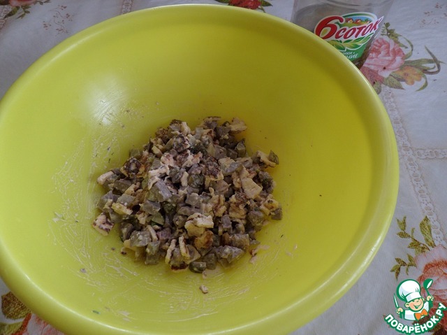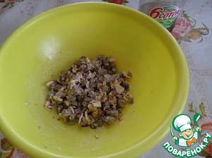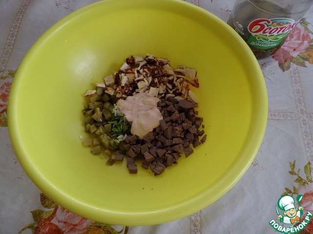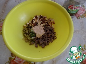 Выкладываем нарезанные ингредиенты в чашку. Добавляем приготовленную заправку.