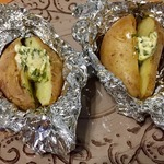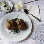 Картофель достать их духовки надрезать и положить по нескольку кругляшков зеленого масла в разрез каждого клубня пока он горячий. Скорее подавать к столу!