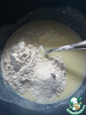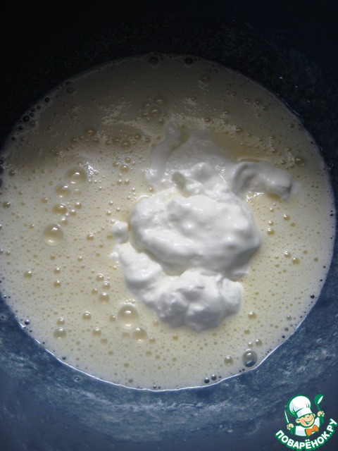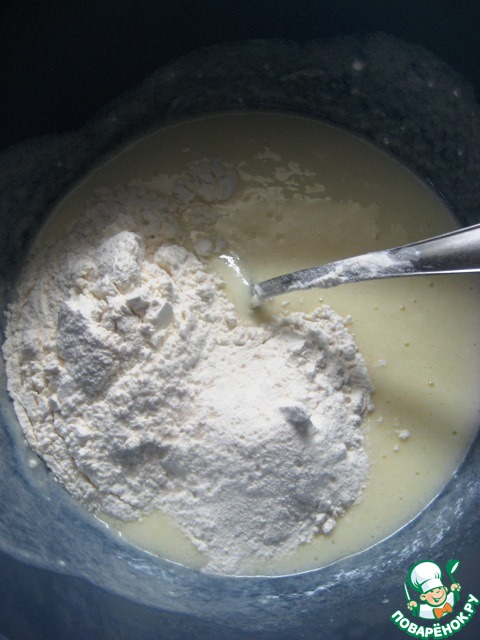 Добавить просеянную муку, щепотку соли и разрыхлитель теста. Хорошо перемешать (тесто по консистенции как густая сметана).
