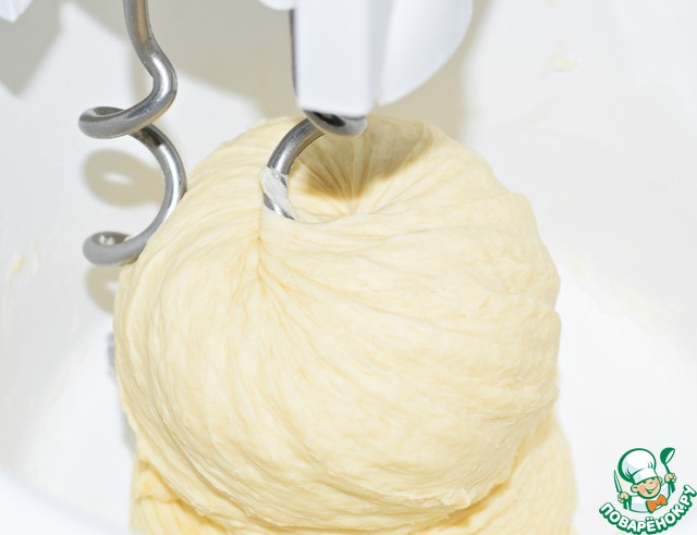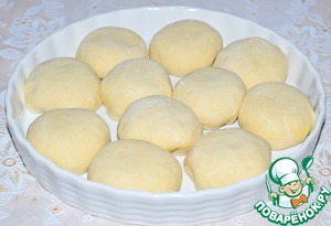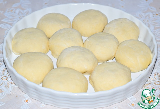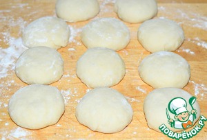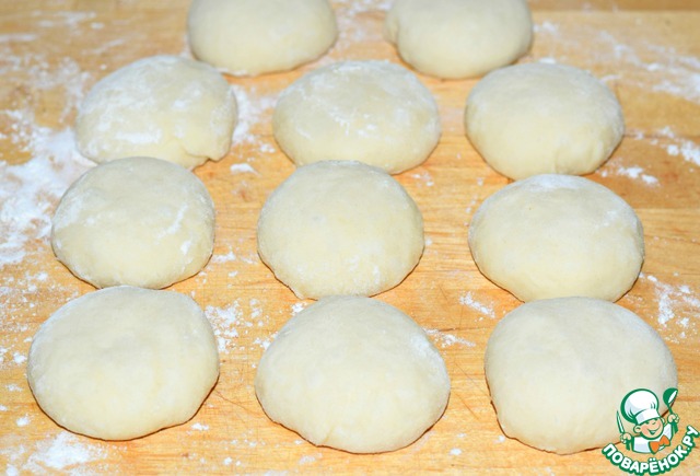 На рабочую поверхность, присыпанную мукой, выложить подошедшее тесто, обмять его и разделить на 11-12 равных частей (по 45-50 г)