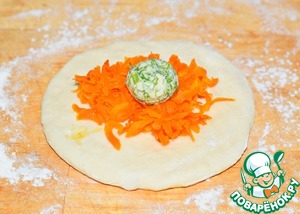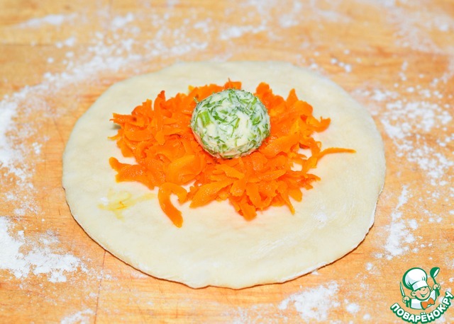 Каждую часть теста раскатать в лепешку. В центр выложить морковь, сверху - шарик укропного масла.