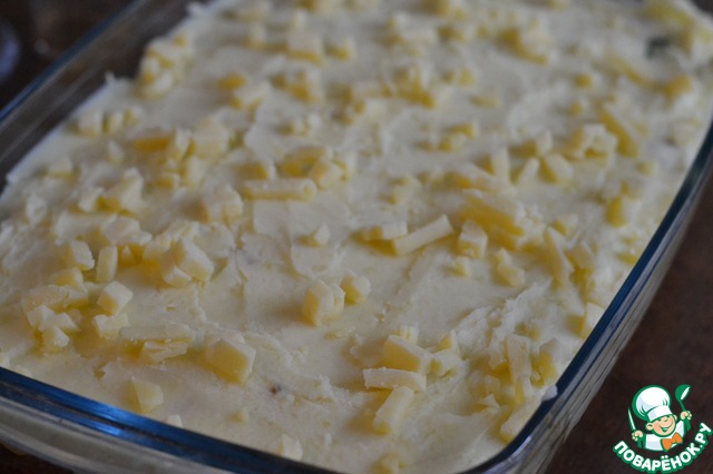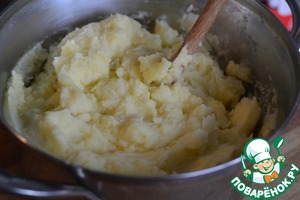 • Из готового картофеля приготовить пюре, добавив к нему масло и молоко. Хорошо перемешать, посолить по вкусу, прикрыть и оставить в теплом месте.