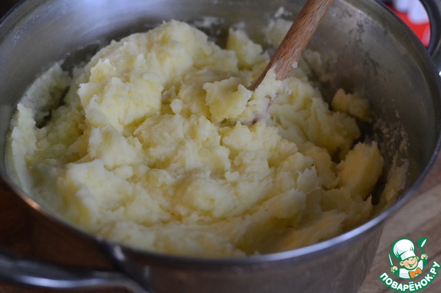 Из готового картофеля приготовить пюре, добавив к нему масло и молоко. Хорошо перемешать, посолить по вкусу, прикрыть и оставить в теплом месте.