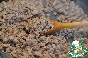 • На сухой сковороде обжарить фарш.