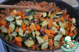 • Вмешать к мясу овощи. Аккуратно перемешать и снять с огня.