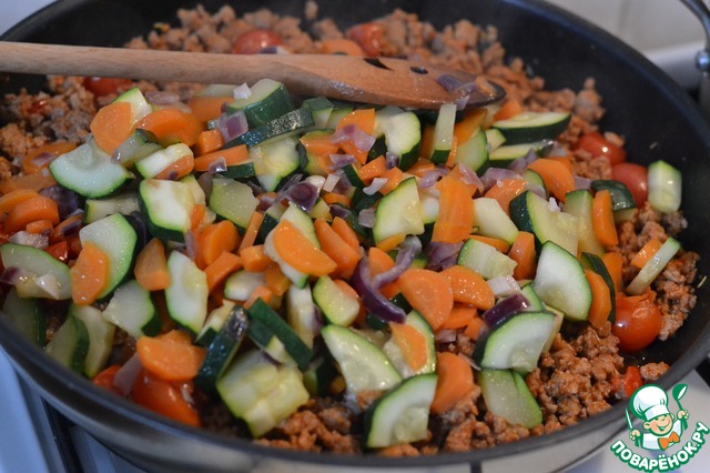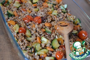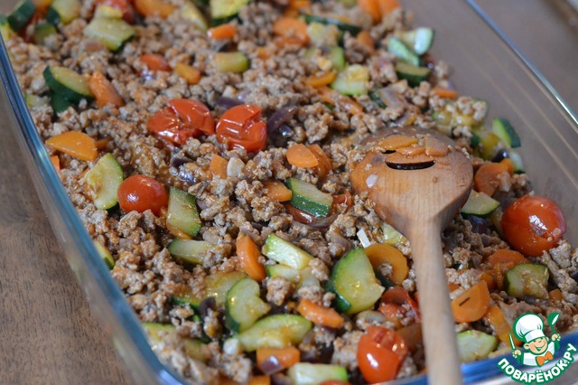Выкладываем овощи с мясом.