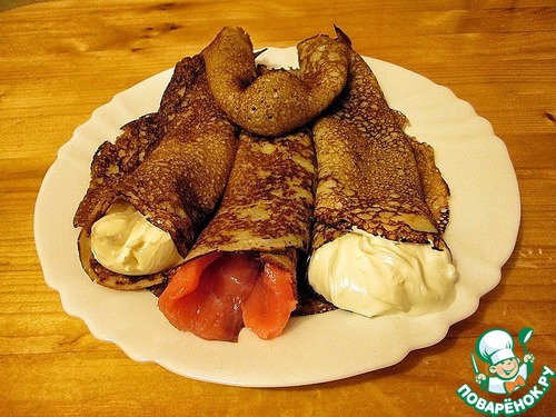 Слева на право – Блин с плавленым сыром, блин с соленой рыбкой, блин со сметаной.