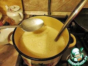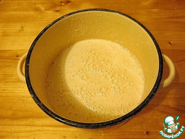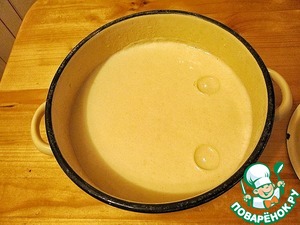 Можно приступать к жарке. НО! Перед жаркой надо добавить в тесто 4 ст. л. крутого кипятка и хорошенько размешать, зачем сие нужно я не знаю. От 4х ложек оно заварным не станет, так бабушки делали, говорили что ОБЯЗАТЕЛЬНО. Бабушкам верить надо.