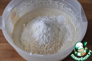 Добавляем просеянную муку, разрыхлитель, кокосовую стружку, перемешиваем всё лопаткой до однородного состояния.