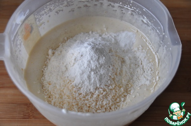 • Добавляем просеянную муку, разрыхлитель, кокосовую стружку, перемешиваем всё лопаткой до однородного состояния.