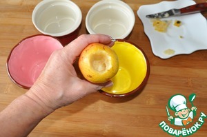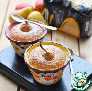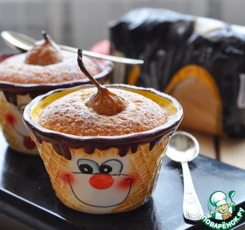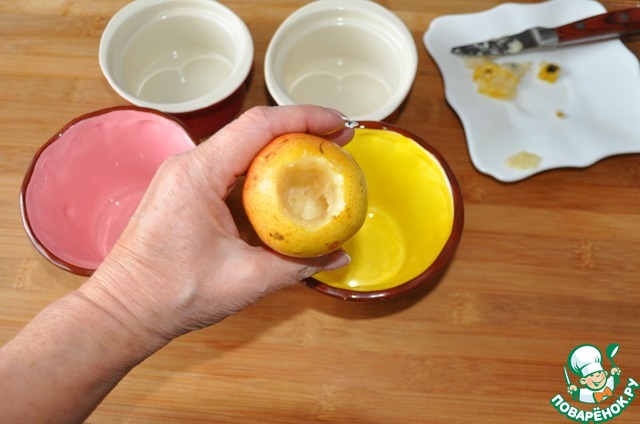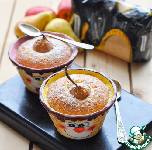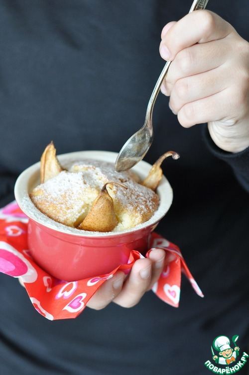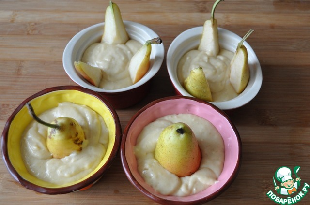 Можно класть целые небольшие груши посредине, а потом заполнять тестом до 2/3. А можно поставить у стенок по 1/2, 1/3 или 1/4 груши и заполнить тестом.