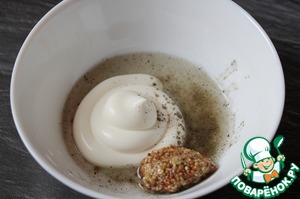 В чашке смешать майонез с огурченым рассолом, черным перцем и горчицей.