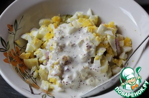 Яйца очистить, нарезать на кубики и добавить в салат.