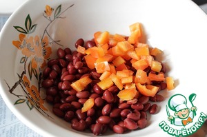 Сладкий перец вымыть, обсушить, очистить от семян и плодоножки, нарезать на небольшие кубики и добавить к фасоли.
