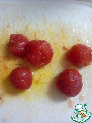 Помидоры черри обдать кипятком и очистить от кожуры. Можно этот шаг опустить.