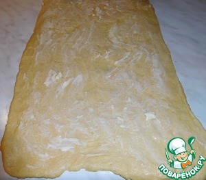 Подошедшее тесто раскатать (хотя оно очень нежное, скалка мне даже не пригодилась, я просто растянула руками) толщиной около 0,5 см и смазать сливочным маслом комнатной температуры.